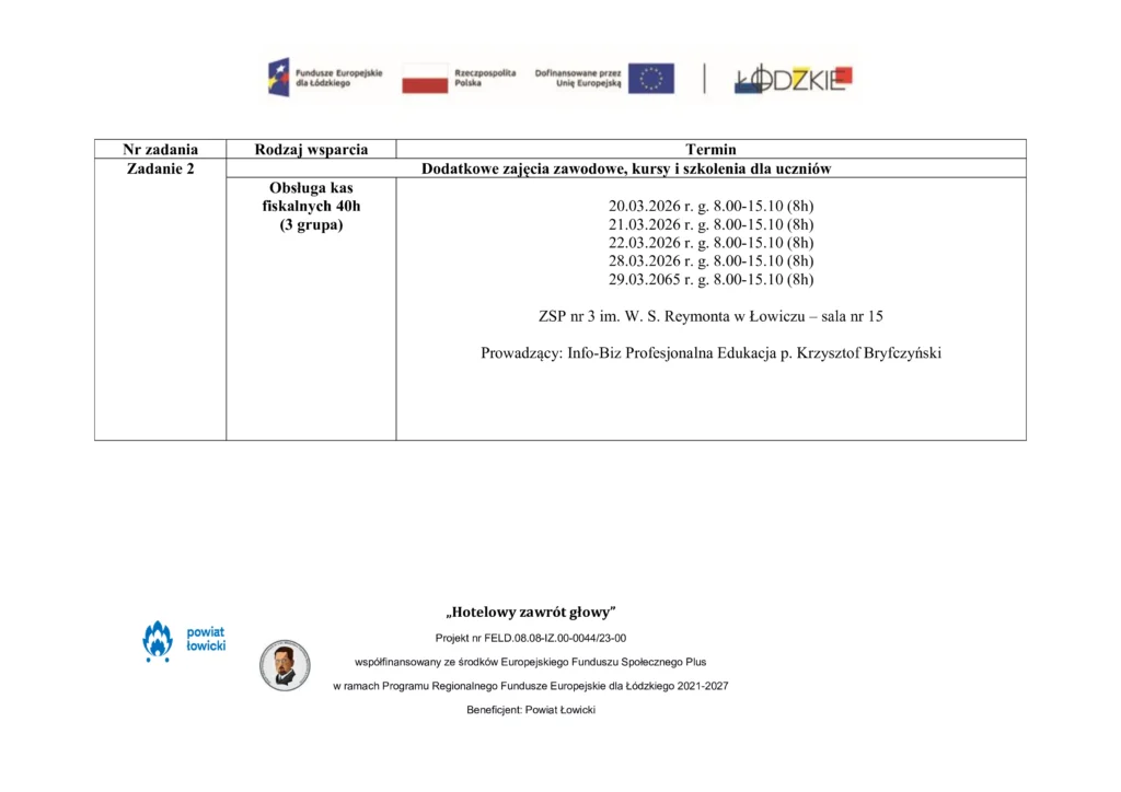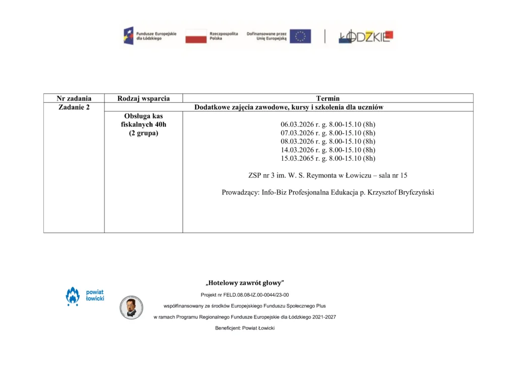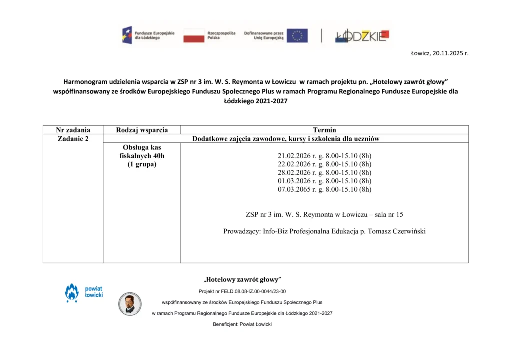 Harmonogram udzielenia wsparcia w ZSP nr 3 im. W. S. Reymonta w Łowiczu w ramach projektu pn. „Hotelowy zawrót głowy” współfinansowany ze środków Europejskiego Funduszu Społecznego Plus w ramach Programu Regionalnego Fundusze Europejskie dla Łódzkiego 2021-2027