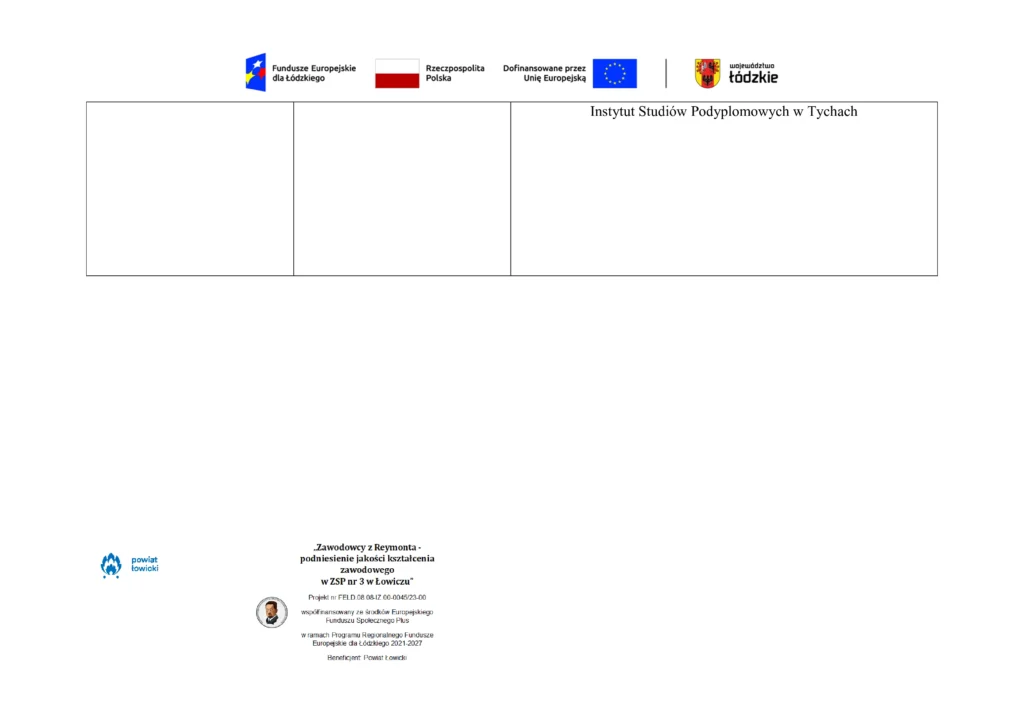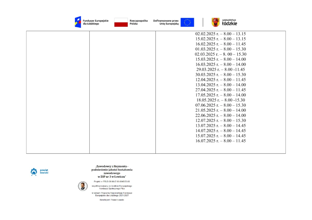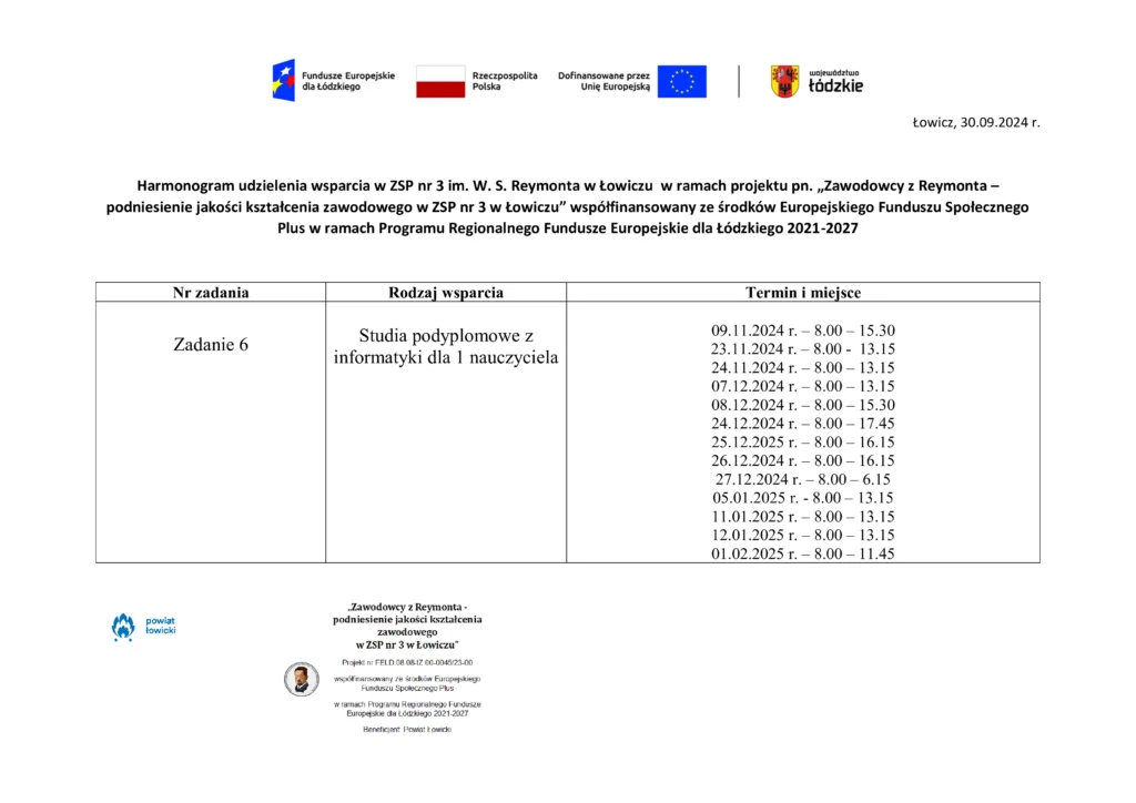 Harmonogram udzielenia wsparcia w ZSP nr 3 im. W. S. Reymonta w Łowiczu w ramach projektu pn. „Zawodowcy z Reymonta – podniesienie jakości kształcenia zawodowego w ZSP 3 w Łowiczu” współfinansowany ze środków Europejskiego Funduszu Społecznego Plus w ramach Programu Regionalnego Fundusze Europejskie dla Łódzkiego 2021-2027