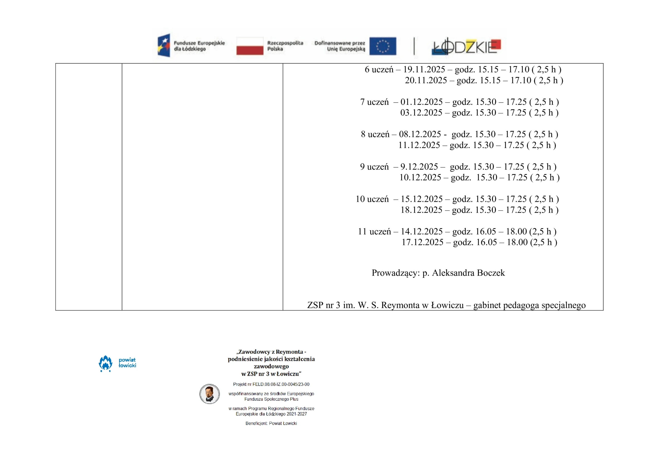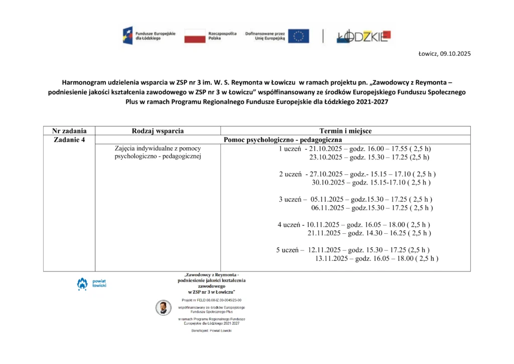 Harmonogram udzielenia wsparcia w ZSP nr 3 im. W. S. Reymonta w Łowiczu w ramach projektu pn. „Zawodowcy z Reymonta – podniesienie jakości kształcenia zawodowego w ZSP nr 3 w Łowiczu” współfinansowany ze środków Europejskiego Funduszu Społecznego Plus w ramach Programu Regionalnego Fundusze Europejskie dla Łódzkiego 2021-2027