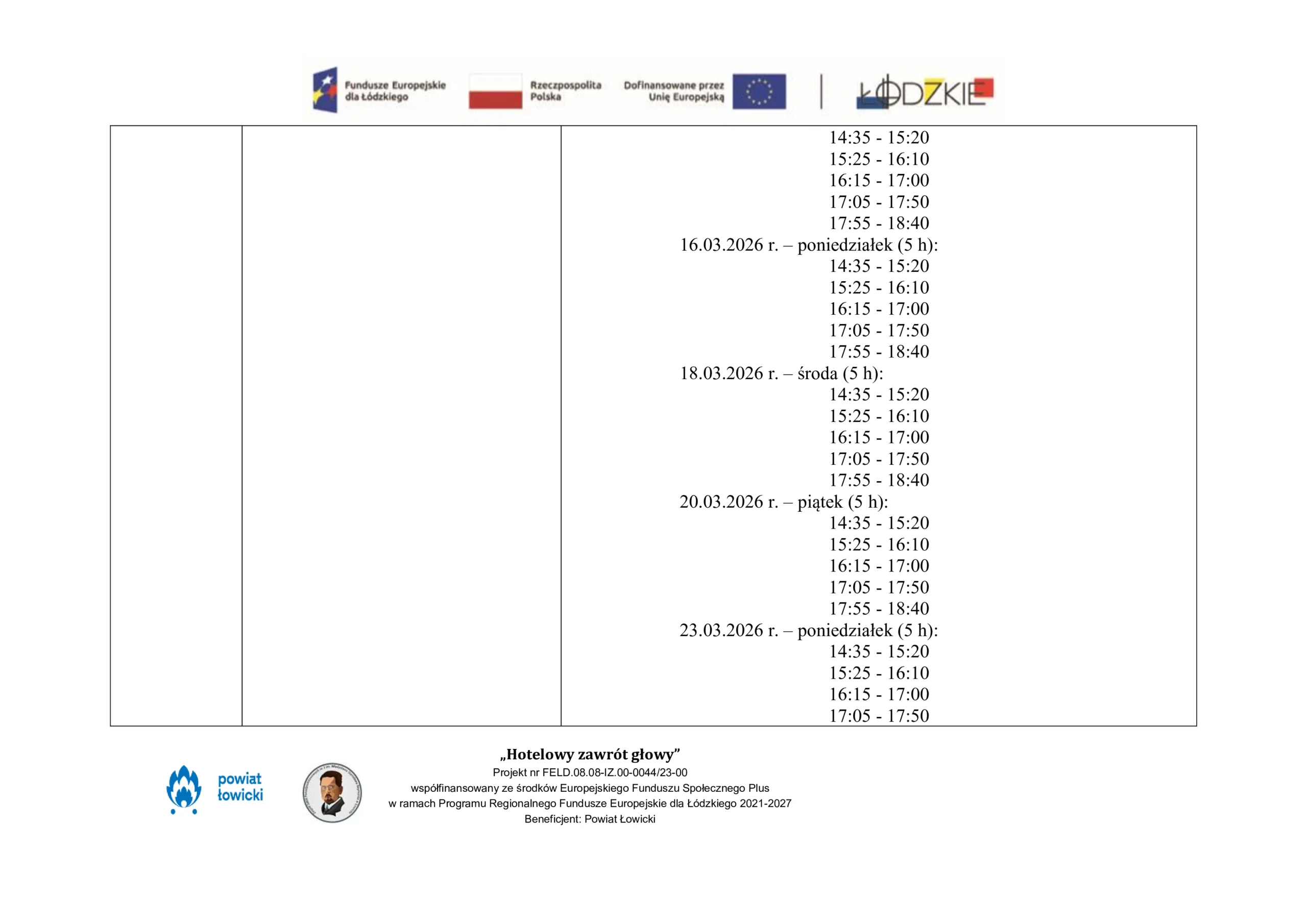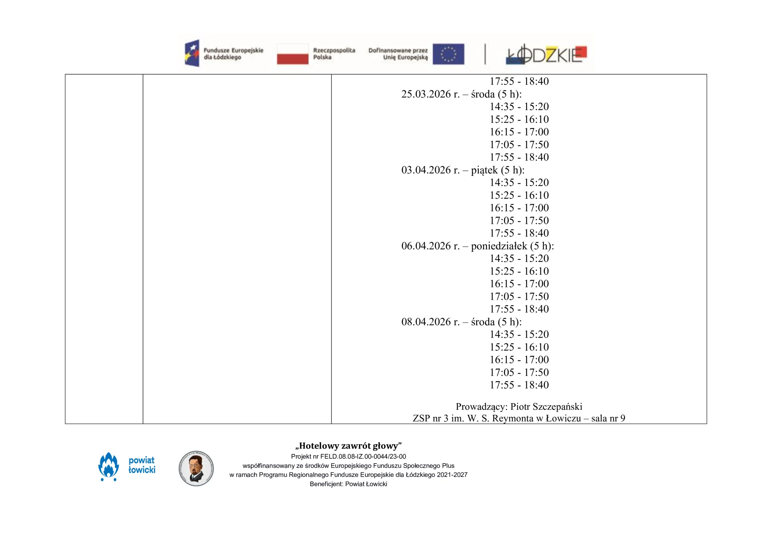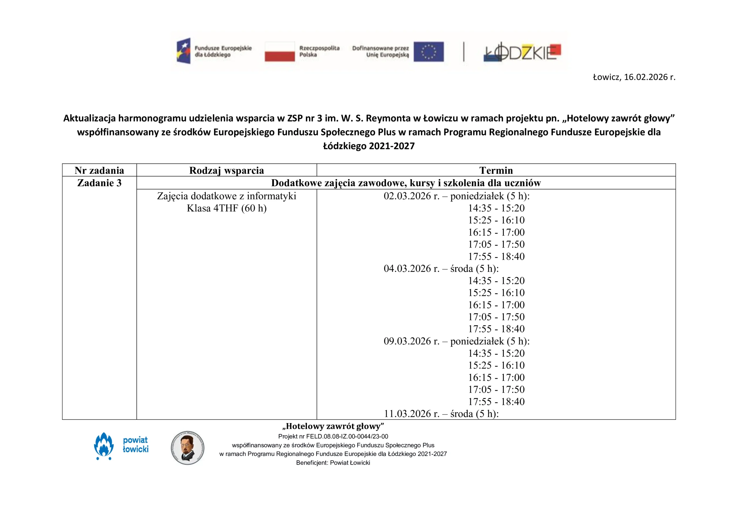 Harmonogram udzielenia wsparcia w ZSP nr 3 im. W. S. Reymonta w Łowiczu w ramach projektu pn. „Hotelowy zawrót głowy” współfinansowany ze środków Europejskiego Funduszu Społecznego Plus w ramach Programu Regionalnego Fundusze Europejskie dla Łódzkiego 2021-2027