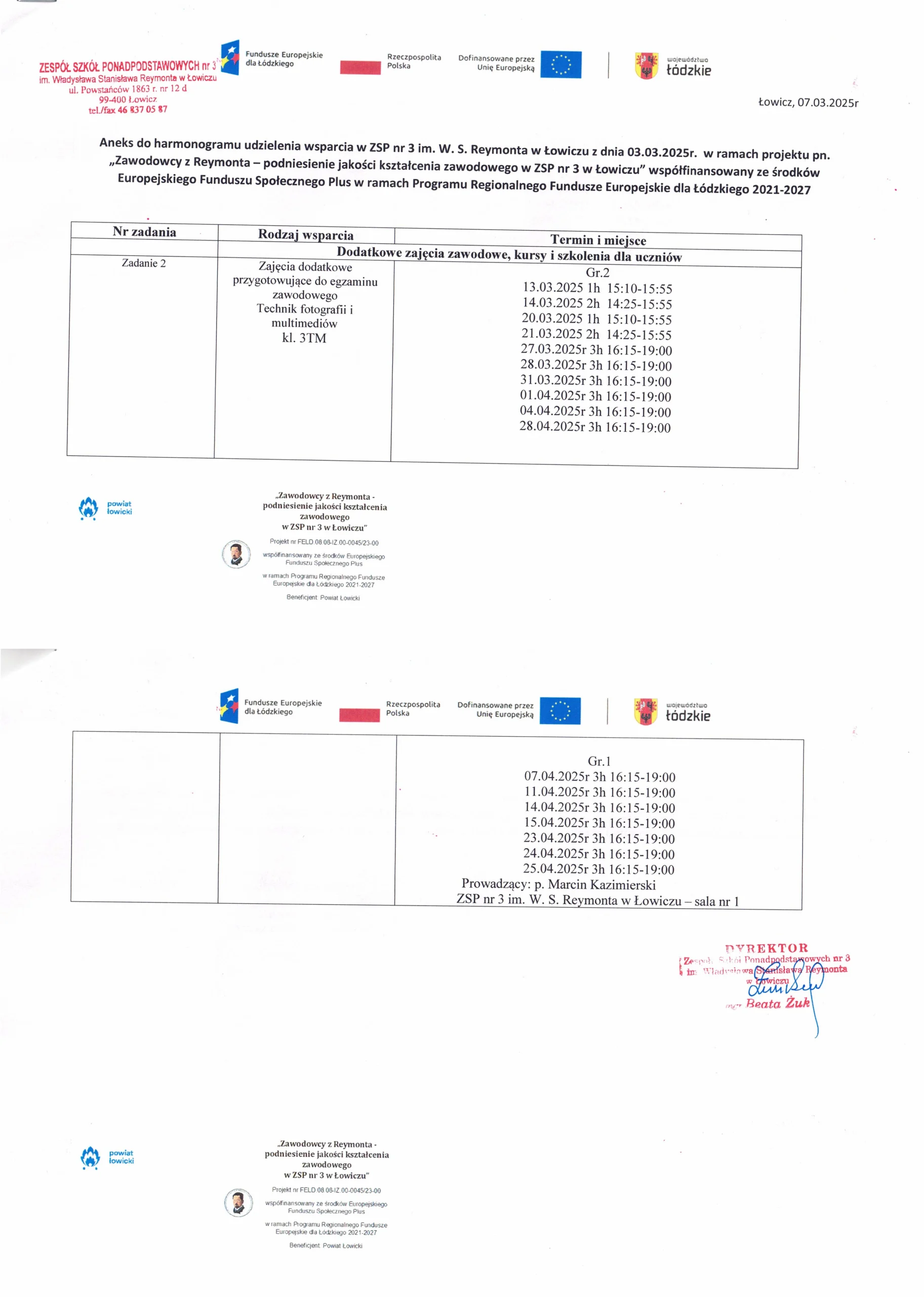 Harmonogram udzielenia wsparcia w ZSP nr 3 im. W. S. Reymonta w Łowiczu w ramach projektu pn. „Zawodowcy z Reymonta – podniesienie jakości kształcenia zawodowego w ZSP nr 3 w Łowiczu” współfinansowany ze środków Europejskiego Funduszu Społecznego Plus w ramach Programu Regionalnego Fundusze Europejskie dla Łódzkiego 2021-2027